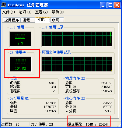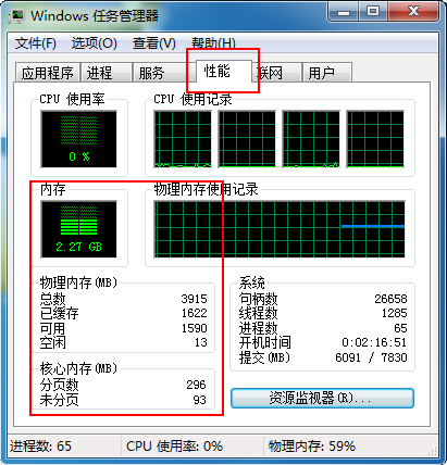 打开任务管理器窗口,然后选择“性能”选项卡,在性能选项卡中即可看到系统的内存总数以及当前使用的内存大小以及可用的空闲内存的大小。