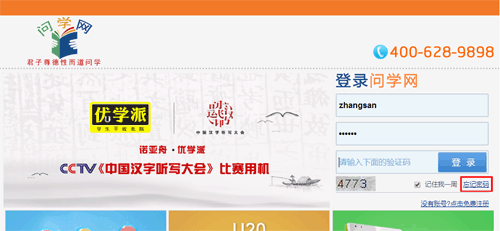 如果您忘记了登录问学网的密码,您可以在问学网登录界面中点击“忘记密码”链接(下图红色框中的部分),跳转到找回密码界面。