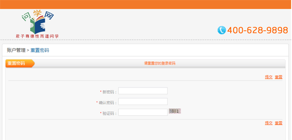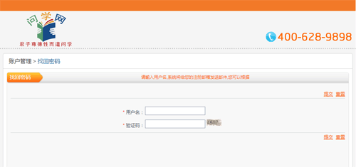 请在此界面中输入您注册的问学网账号和验证码后,点击“提交”按钮,系统会自动发送一封密码重置邮件到您注册账号时提交的邮箱中。