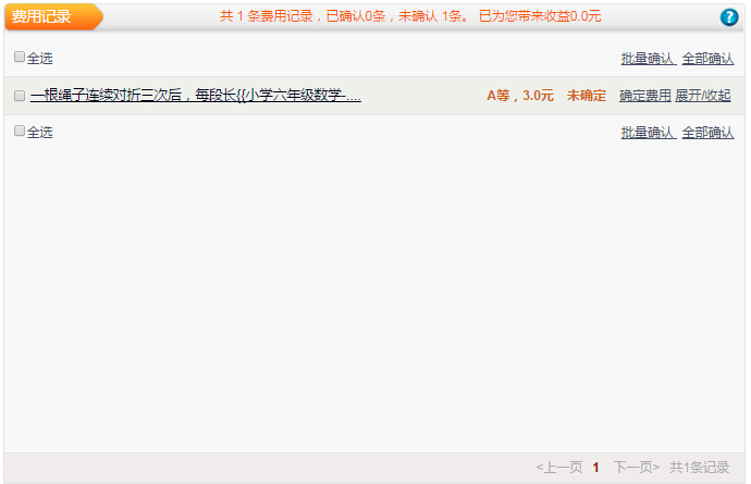 对于未确认费用的费用记录,您可以点击该记录右边的“确认”链接确认费用,确认之后该记录的状态变为“已确认”状态,系统将在当月结算日为该任务支付 费用。