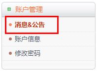 在您进行一些操作之后,后台可能要对您所做的操作进行评审,评审的结果会以站内消息的形式发送给您,您可以通过点击左边菜单栏中的 “账户管理>>消息&公告”打开“消息&公告”界面查看这些消息。