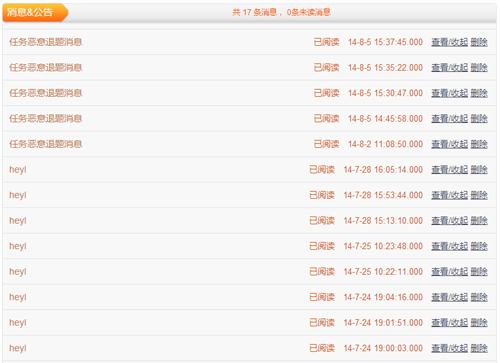 您可以点击某条消息右方的“删除”链接将该消息删除,操作成功后,该消息将被删除。