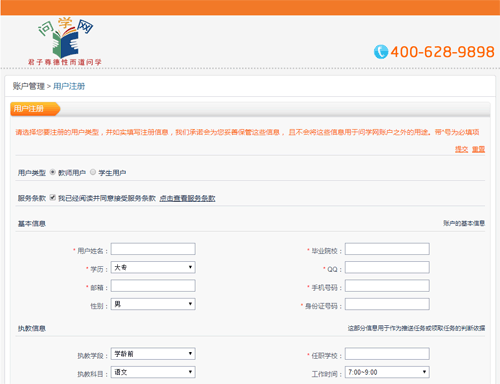如果您是一个在校老师,请在用户类型中选择“教师用户”,否则选择“学生用户”,并在查看服务条款后勾选“我已经阅读并接受服务条款”选项, 然后输入您的注册信息,并点击“提交”,提交注册信息。