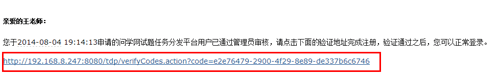 您注册的账户经过后台管理员审核后,系统会自动发送一封验证邮件到您注册时提交的邮箱中,该邮件包含一个验证链接,您需要点击这个链接(红色框中的部分) 访问系统,通过邮箱验证。
