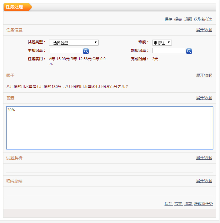 点击“在线处理”链接后,会显示该任务上一次的答案,则需要用户删除之前填写的错误答案,重新输入新的答案在提交。