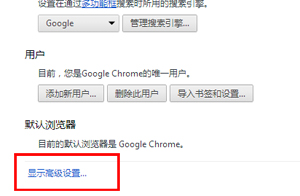 点击设置菜单后,打开Chrome设置界面,点击设置界面下方的“显示高级设置”连接,打开高级设置选项
