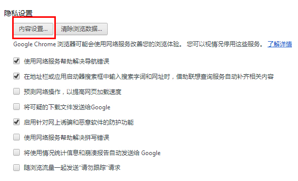 展开高级设置选项后,找到“隐私设置”选项,点击该选项中的“内容设置”按钮,打开“内容设置”窗口。
