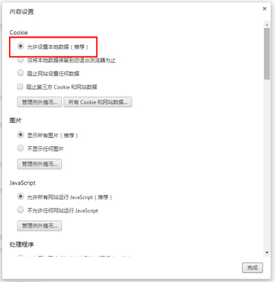 在“内容设置”窗口的Cookie栏中,选择“允许设置本地数据”选项,然后点击“完成”按钮保存设置。