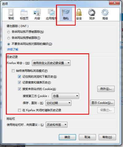 在“历史记录”栏中选择“使用自定义历史记录设置”,然后勾选“接受来自站点的Cookie”,并选择“接受第三方Cookie”的方式为“总是” ,“保存,直到”选择“过期”。